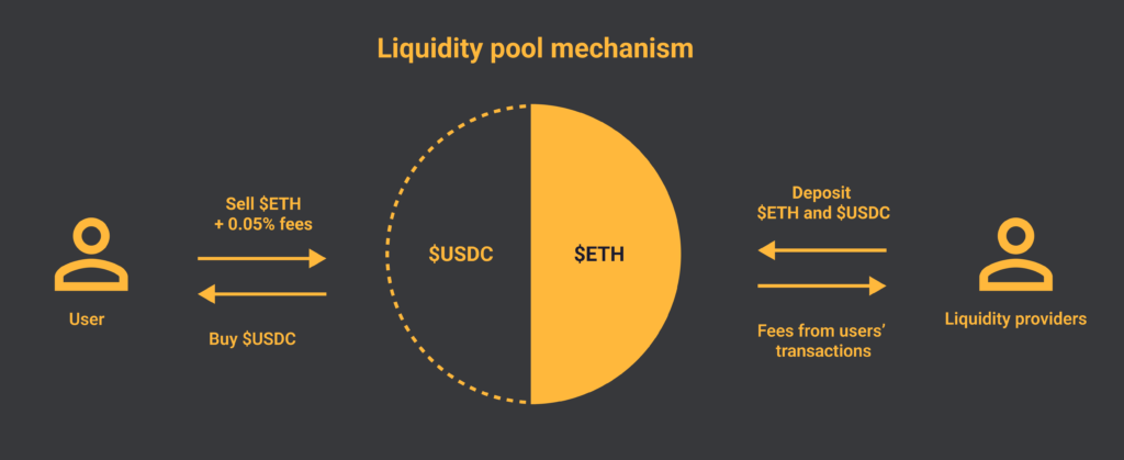 Suppose a decentralized exchange allows trading on the ETH/USDC pair, meaning we can freely exchange ETH tokens for USDC and vice versa. For this to be possible, there must be an adequate amount of both tokens in the smart contract.