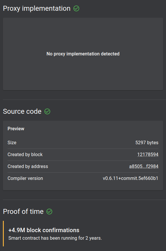 Liquity's smart contracts are immutable, meaning they can't be upgraded or changed. They are all green in our security checks. To access Liquity, choose a web interface (frontend) operated by third-party applications & integration services.