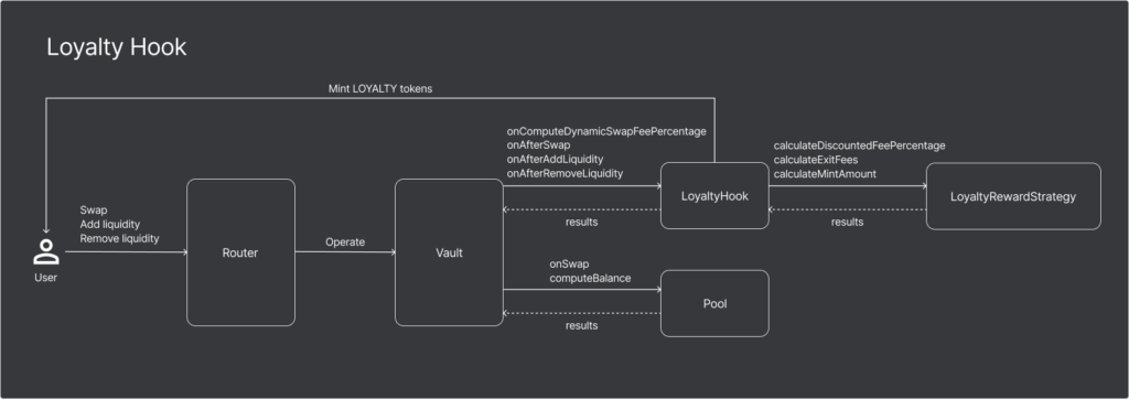 The core contract that extends the pool functionality with loyalty incentive mechanisms. LoyaltyHook delegates calculation tasks to the ILoyaltyRewardStrategy implementations.